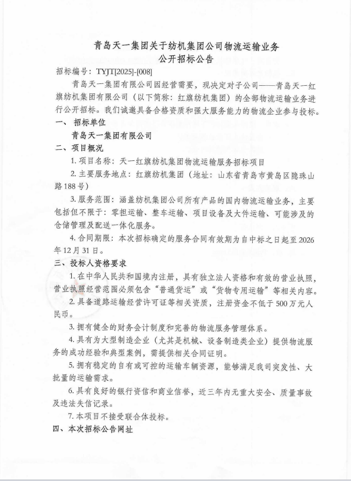 青島市天特體就紡機團休機構物流貨運運輸配送關業大肆開標告知布告.